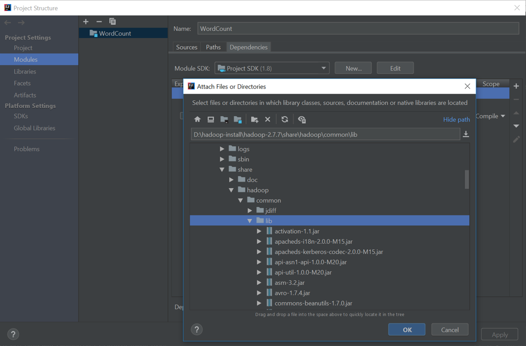 Project Name, Project location > Finish - Muat Hadoop Library dari menu File > Project Structure > Modules > Dependencies > + > 1 JARs or directories…